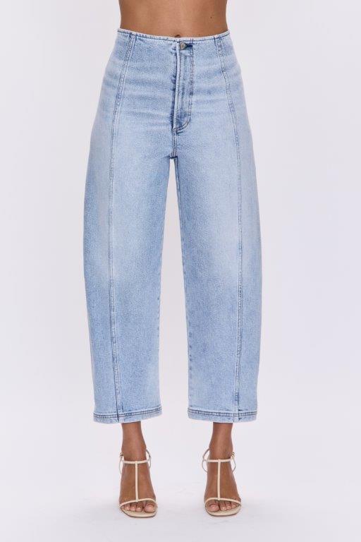 The ultimate cool girl denim. Blair sits as a high rise with a unique barrel silhouette that offers a modern twist on proportion, finished with a 27" inseam. The absence of a waistband creates a smooth, streamlined look that feels inherently sophisticated. Chic seaming details add elevated flair without effort. Crafted from our comfort stretch denim in Soho, a medium dark wash.