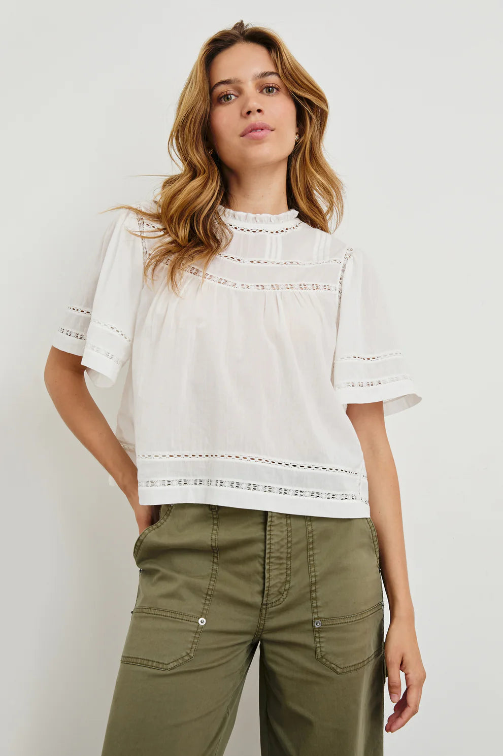 A crewneck baby doll blouse, the Daisy Top is an airy essential for warmer weather. Crafted from soft beach cotton, it's finished with sheer weaving and ruffles at the collar.
