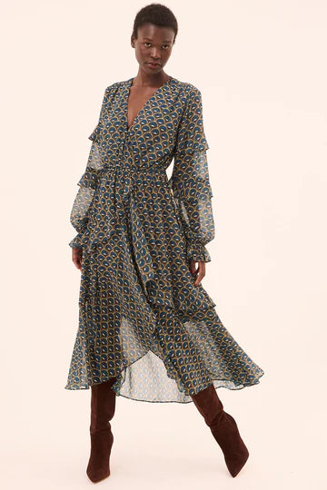 The Delora dress is a dreamy, bohemian-inspired midi silhouette cut from airy Dandelion printed chiffon. Long blouson sleeves are crafted with wide tiered ruffles and finished with elasticated ruffle cuffs. A deep crossover V-neckline is accented with gentle gathers at the shoulders, while an elasticated waist flatters the figure. The asymmetrical skirt cascades in wide, staggered crossover ruffles, with a partial lining to the knee. Effortless for fall, it pairs beautifully with everything from knee-high suede boots to strappy heels.
