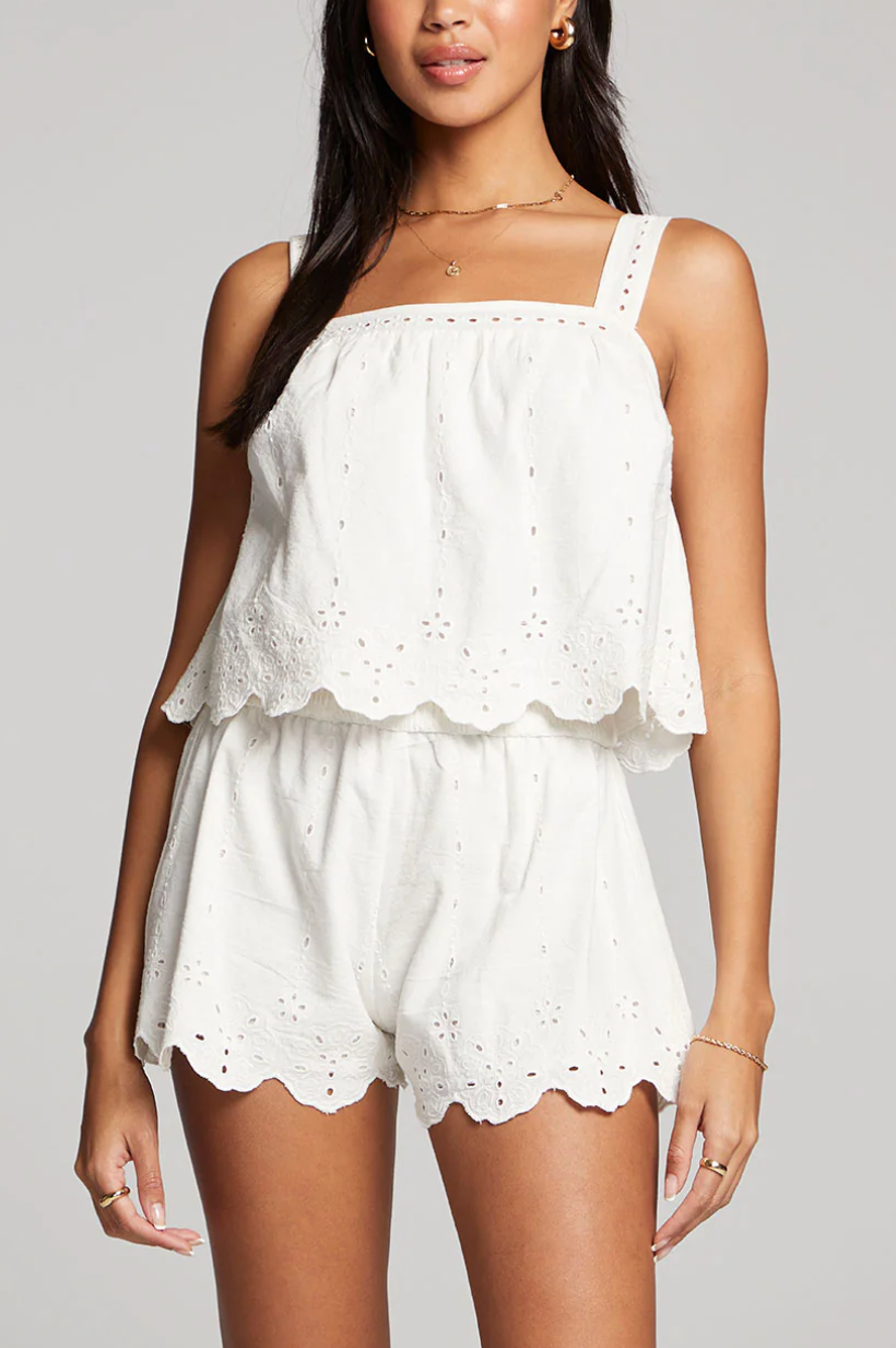 Experience charm and playfulness with the Elysie Tank in Salt. This women's tank top boasts an eye-catching eyelet design and playful scallop bottom detailing. Effortlessly pair with a denim skirt and wedges, or complete the look with the matching Bliss Shorts.
