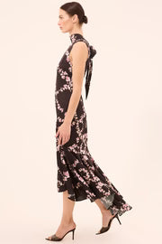 The Laverne dress is a stunning new maxi silhouette cut from our Chained Blossom print satin. Sleeveless and elegant, it features a high mock turtleneck with a tie-back bow and a fitted bodice that flows into a high-low skirt with loose knife pleats. Perfect for your next event or fall wedding, this style pairs effortlessly with both boots and heels.