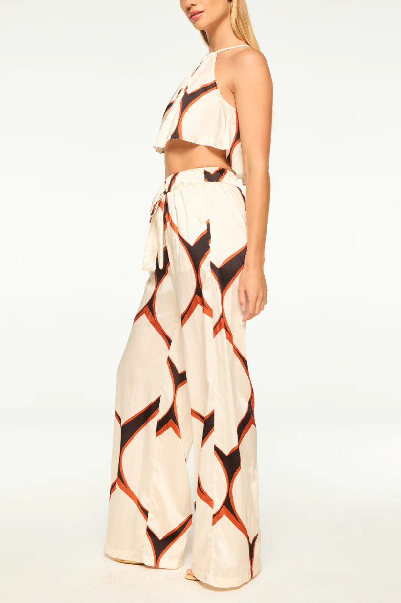 Enhance your vacation wardrobe with the Saana crop top. Made from a crinkle ivory satin with a striking black and brown geo print, this piece features a halter neckline and a back keyhole for added detail. Create an eye-catching look by pairing it with the Tabriz pant.