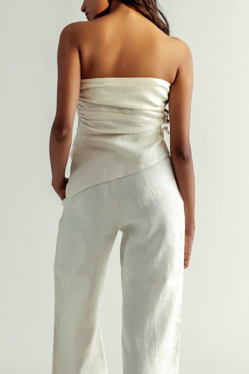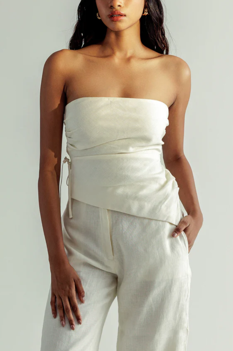 The Salem Top is perfect for a summer day out. With its strapless design and faux drawstring with ruched details, this top offers a relaxed fit that flatters any body type. The asymmetrical hem adds a touch of style, making it an essential addition to your wardrobe.