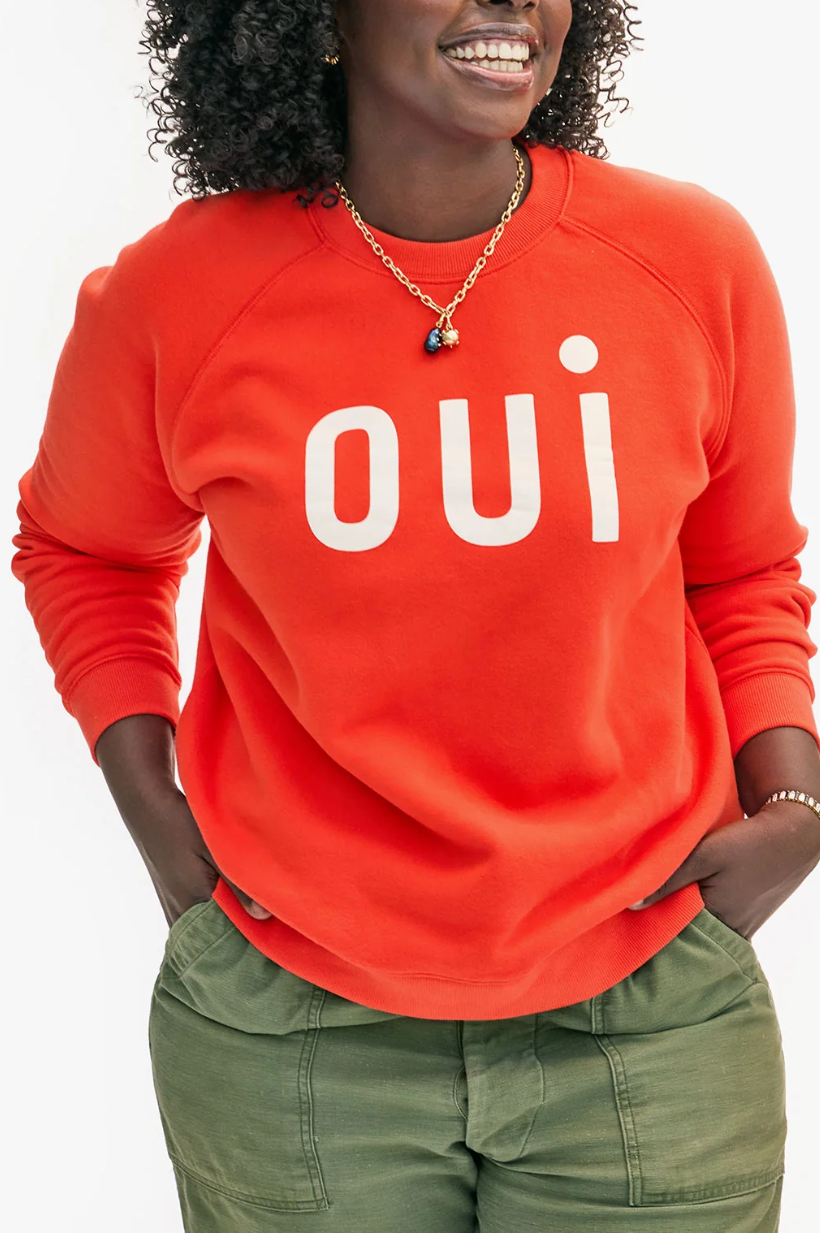 This blood orange sweatshirt features a bold OUI graphic on the front. Perfect for adding a pop of color to any outfit!