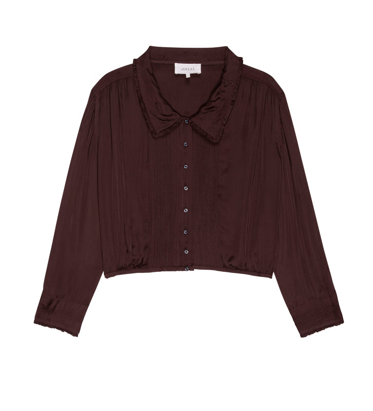 The Finch Top is expertly crafted with a silky fabric, providing a luxurious feel. The collar adds a touch of sophistication, while the ruched front detail adds dimension to the cropped fit. A must-have addition to any wardrobe for a polished and stylish look.