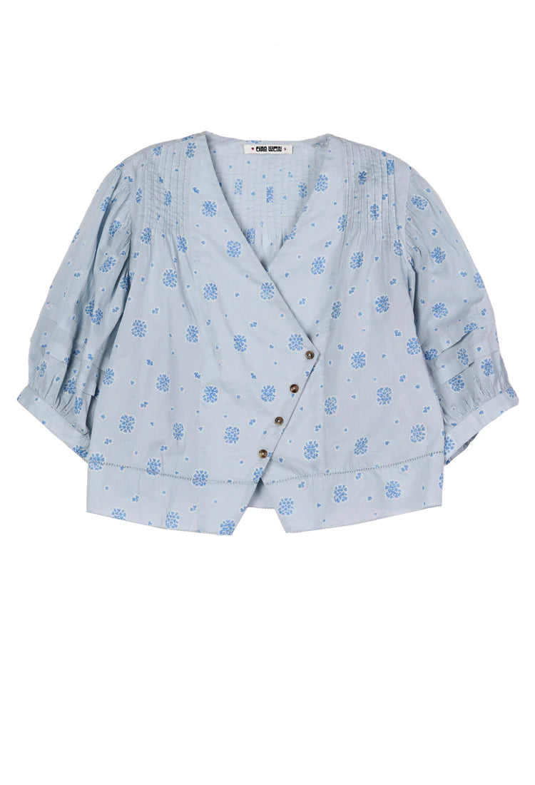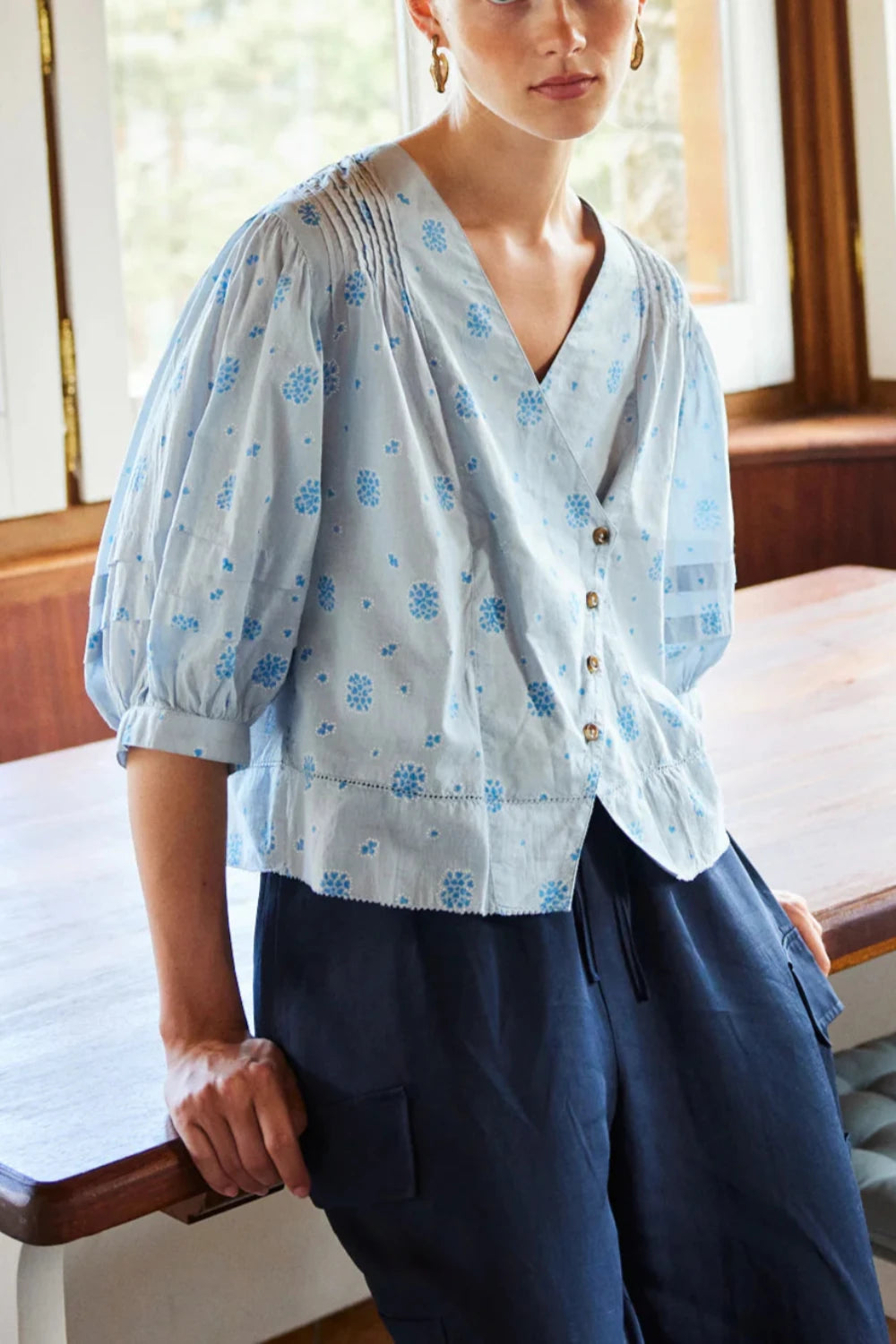 The Ximena Top in dandelion is a cotton voile three quarter length sleeve top featuring pleating details and horn buttons.